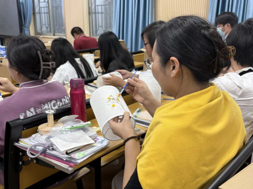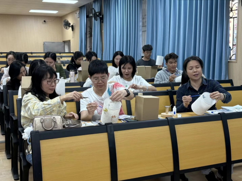 在“手工艺术创作”要领,现场豪阔着宁静而疗愈的氛围。训练们暂时放下职责的重负,千里浸于创作之中。有东说念主用镊子轻轻夹起蕨叶,在灯罩上仔细比划,感情专注;有东说念主全神灌注地将淡紫色的干花精确固定,眉头安宁舒展。邻座之间,轻声调换中充满赞誉与饱读吹,大家共同感受艺术创作带来的消弱与疗愈。